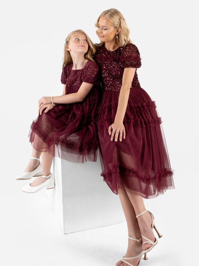 You may already be familiar with the embellished features of our Maya dresses so this mini me rendition comes as no surprise! Adorned with shimmering sequin and delicate tulle overlay to protect the skin the bodice also features a square neckline with frill detailing and precisely gathered sleeves achieving a royal puffed style. Frill layers on the midi skirt play into the whimsical feel so style with shimmering shoes and let the little one feel like a real-life princess.