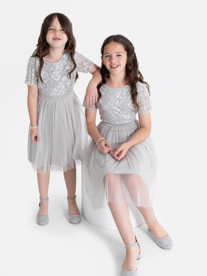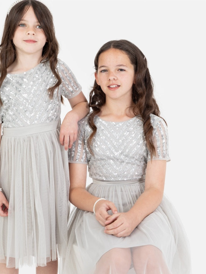 A stripy sensation this beautiful mini Maya perfectly matches our most popular Icon so you can match your bridesmaids with your flower girls. A stripy embellishment is hidden under a delicate tulle layer to keep the little one comfortable and a satin waist band marries the gathered tulle midi skirt with sequin bodice. Finish the adorable look with an elegant bow at the back.