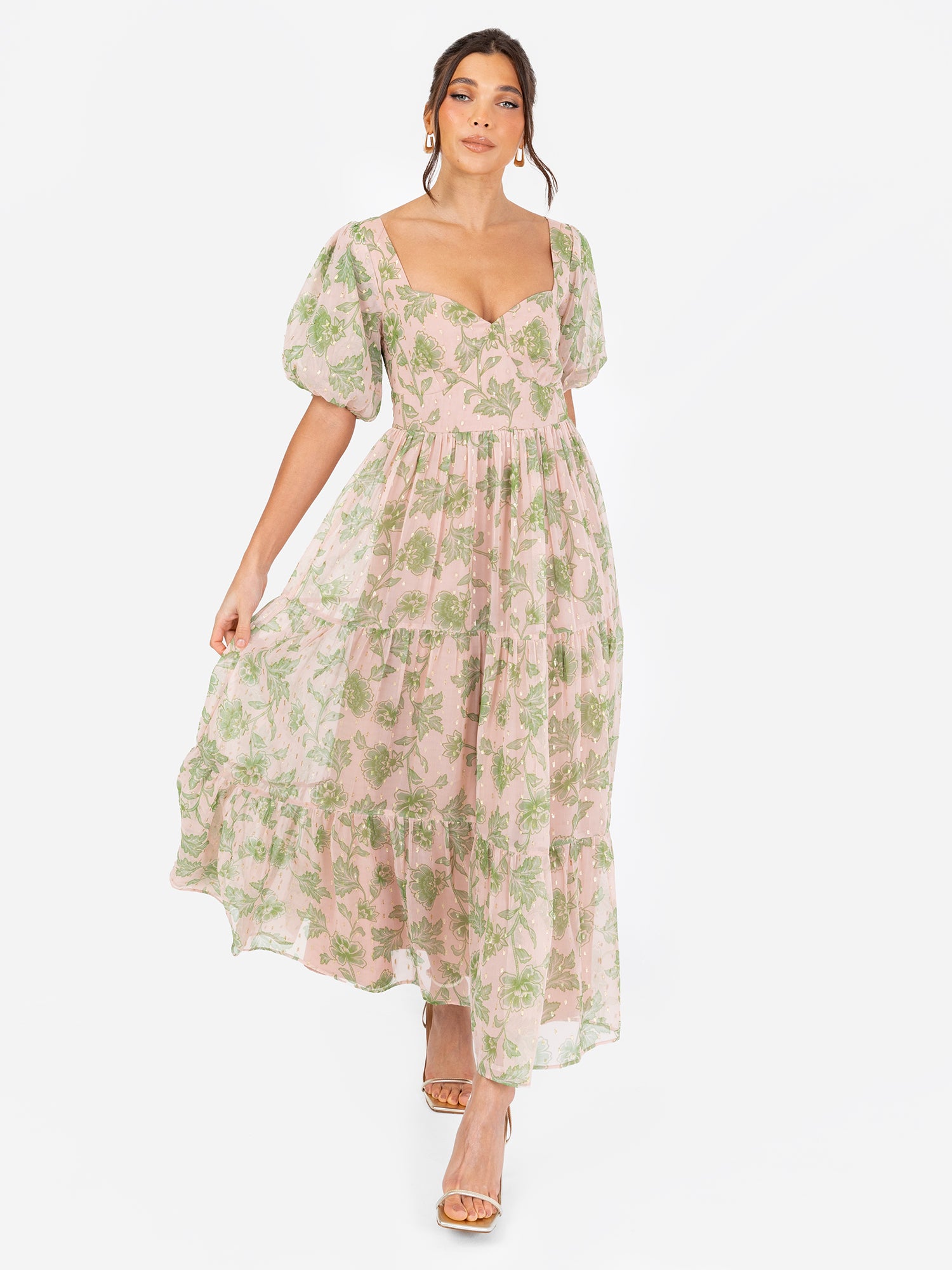 At Anaya with Love each item is consciously designed and made with 100% recycled fabric allowing you to embrace both style and sustainability. Whether you're attending a wedding christening or formal occasion this dress is your go-to piece for making a stunning statement. Featuring a timeless sweetheart neckline and romantic puff sleeves on a structured bodice it strikes the perfect balance between elegance and modern sophistication complete with an alluring self-tie open back. The soft blush pink fabric adorned with delicate green floral prints cascades effortlessly into a tiered skirt ensuring graceful movement with every step. Pair it with strappy heels and minimal jewellery to let the dress truly shine.