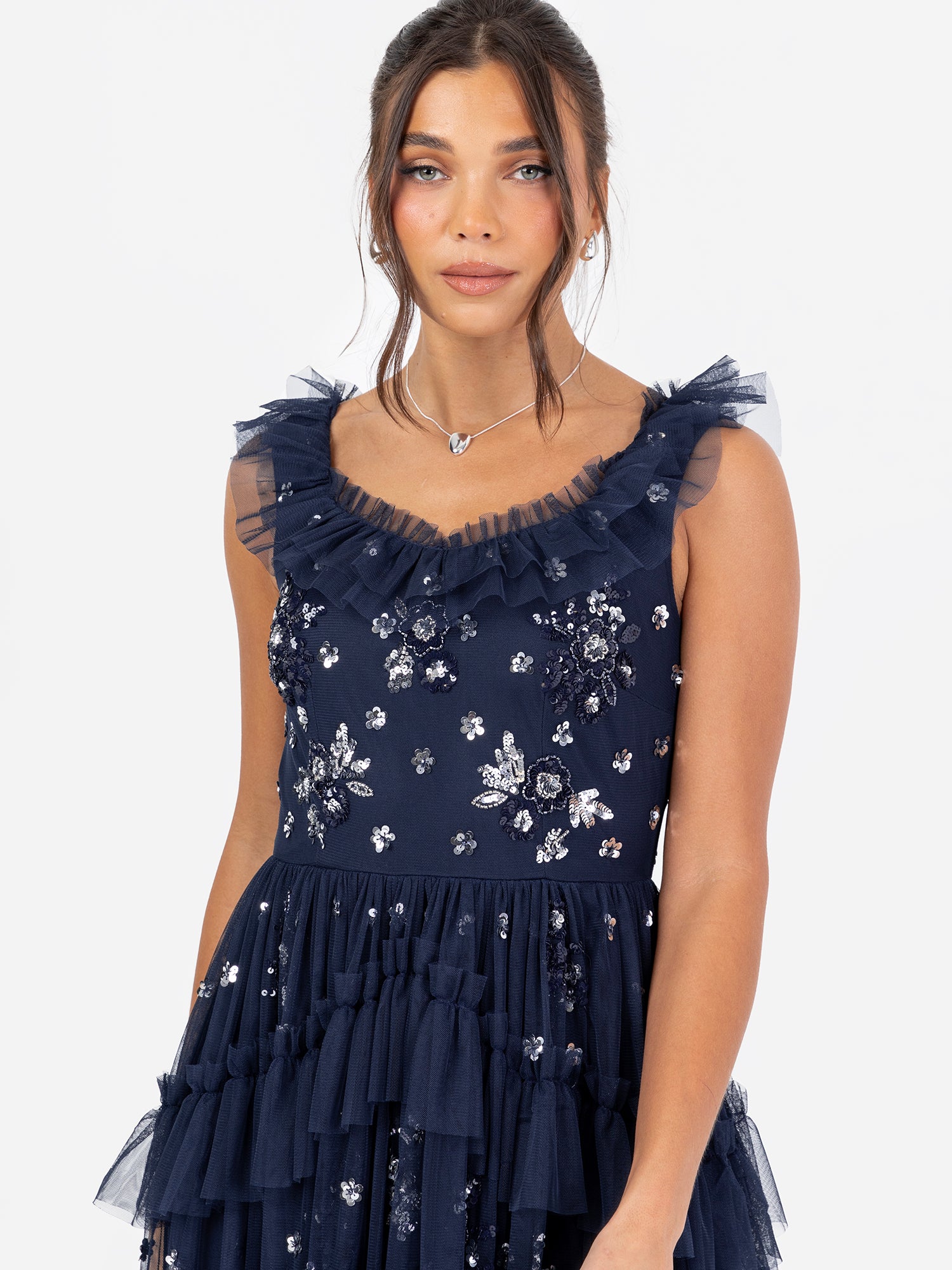 A unique combination of elegance and charm makes this Navy maxi dress the perfect choice for unforgettable occasions such as weddings red-carpet events and award ceremonies. Crafted from high-quality materials it features a soft lining for comfortable wear while the tulle overlay and hand-sewn sequin embellishments create an enchanting finish. Frill detailing on the round-neck bodice and tiered skirt adds a touch of whimsy while the thigh-high slit in the A-line maxi skirt brings a hint of allure making it ideal for striking a pose. Complete the glam look with a messy up-do and silver heels.