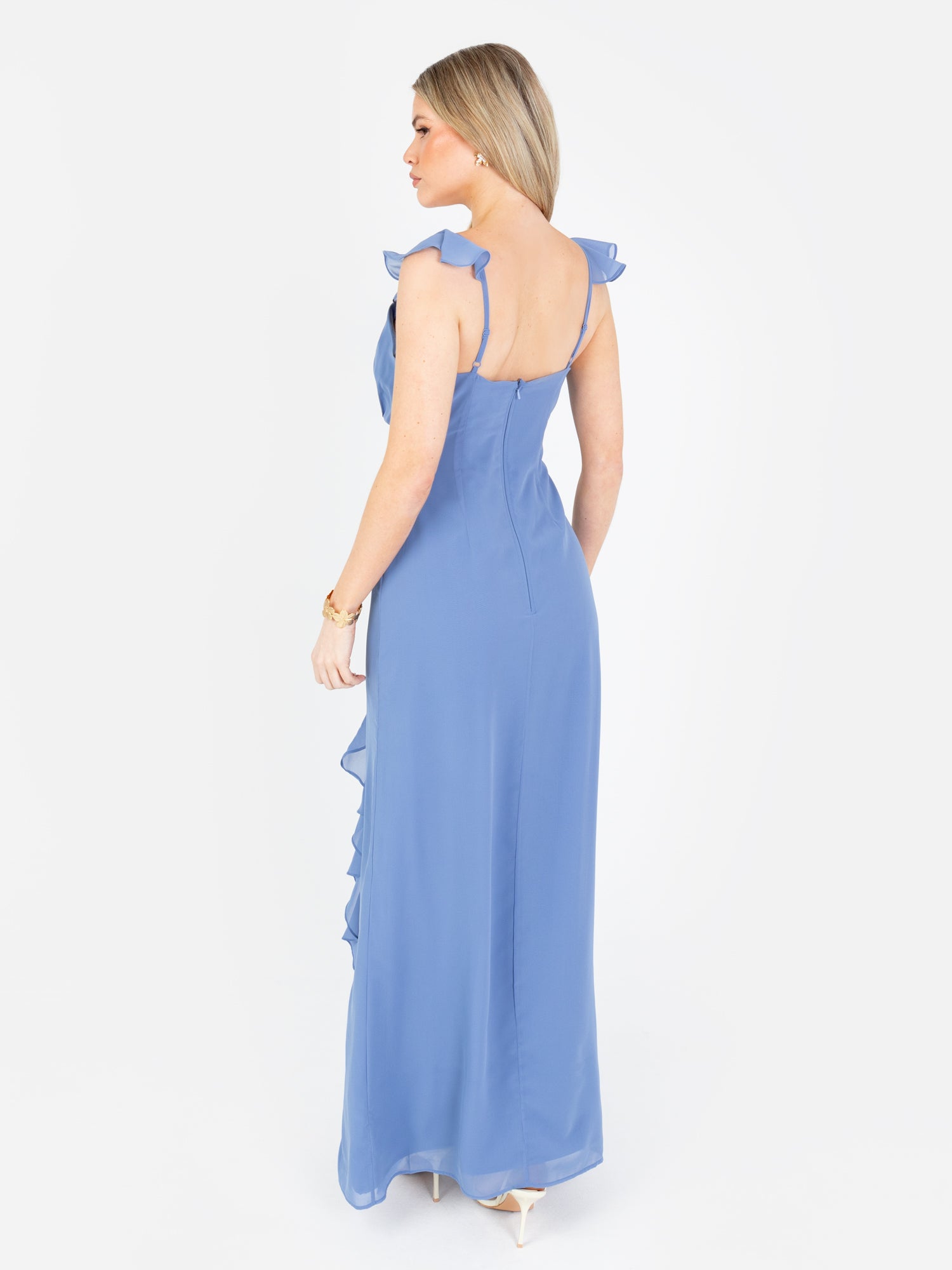 Anaya With Love Ocean Blue Strappy V Neck Maxi Dress with Skirt Split & Ruffle Detail